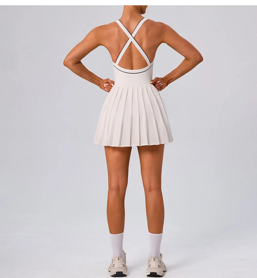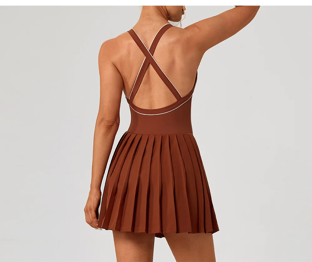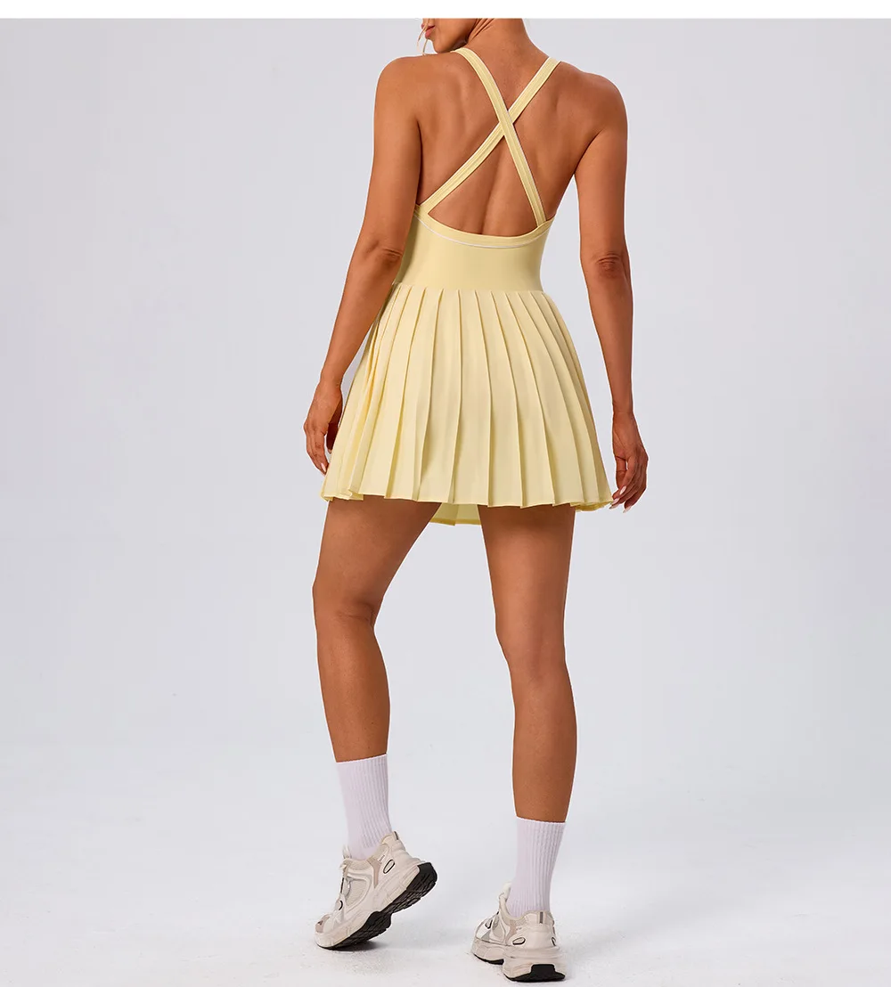 The LUMA Flow Active Dress Jumpsuit blends performance and femininity in a modern athletic silhouette. Designed with a sleeveless cut and elegant cross-back straps, this short one-piece features built-in inner shorts for secure coverage and confident movement.