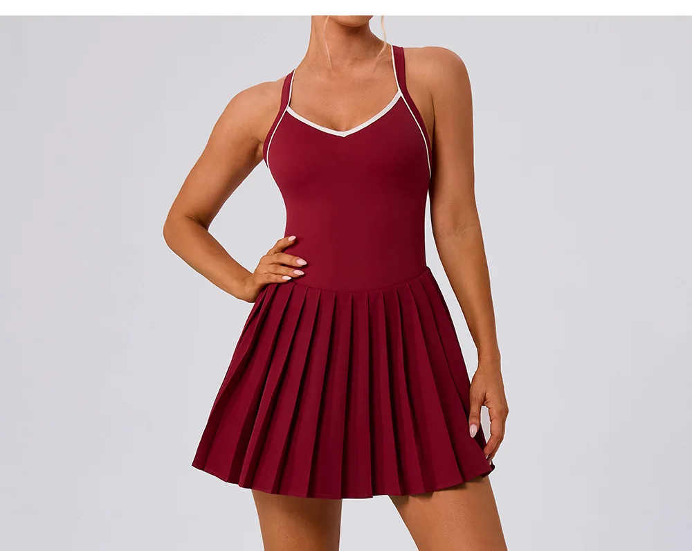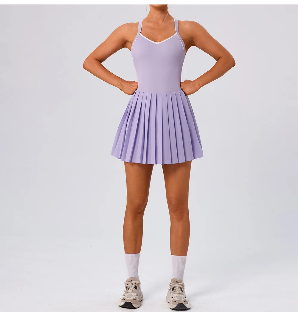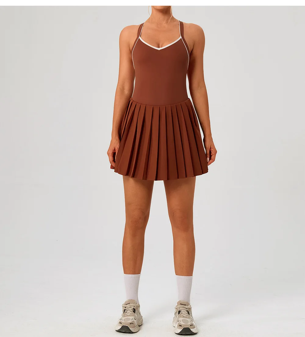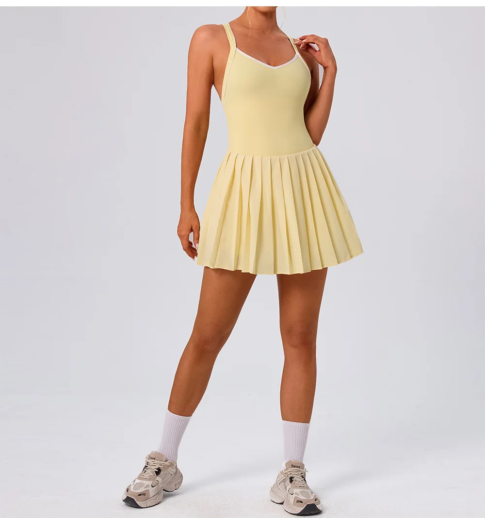 The LUMA Flow Active Dress Jumpsuit blends performance and femininity in a modern athletic silhouette. Designed with a sleeveless cut and elegant cross-back straps, this short one-piece features built-in inner shorts for secure coverage and confident movement.