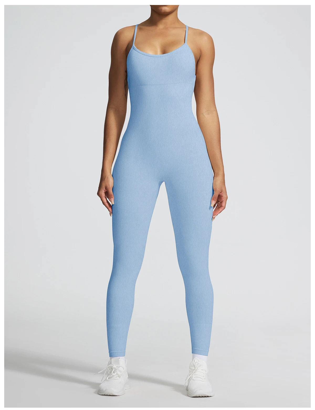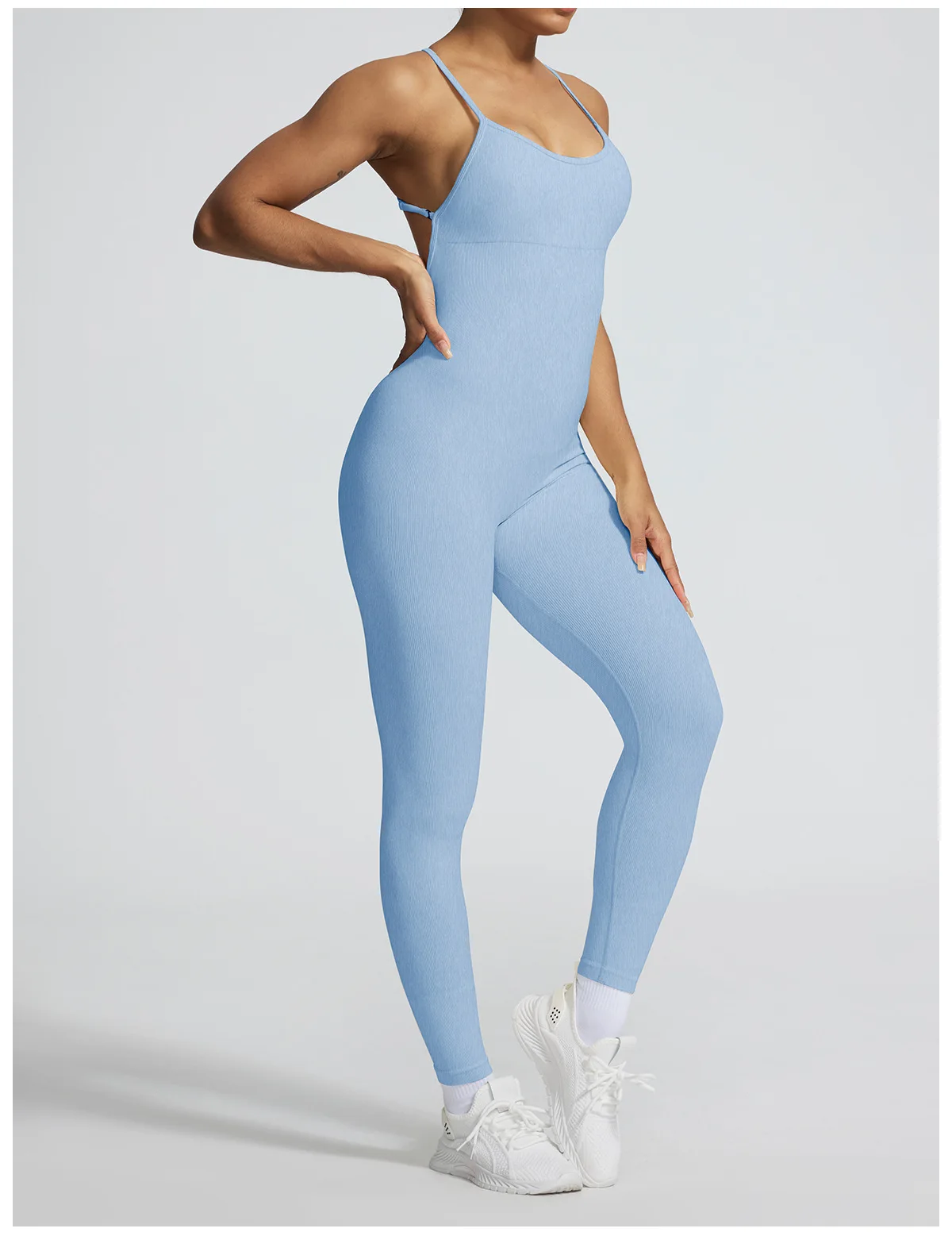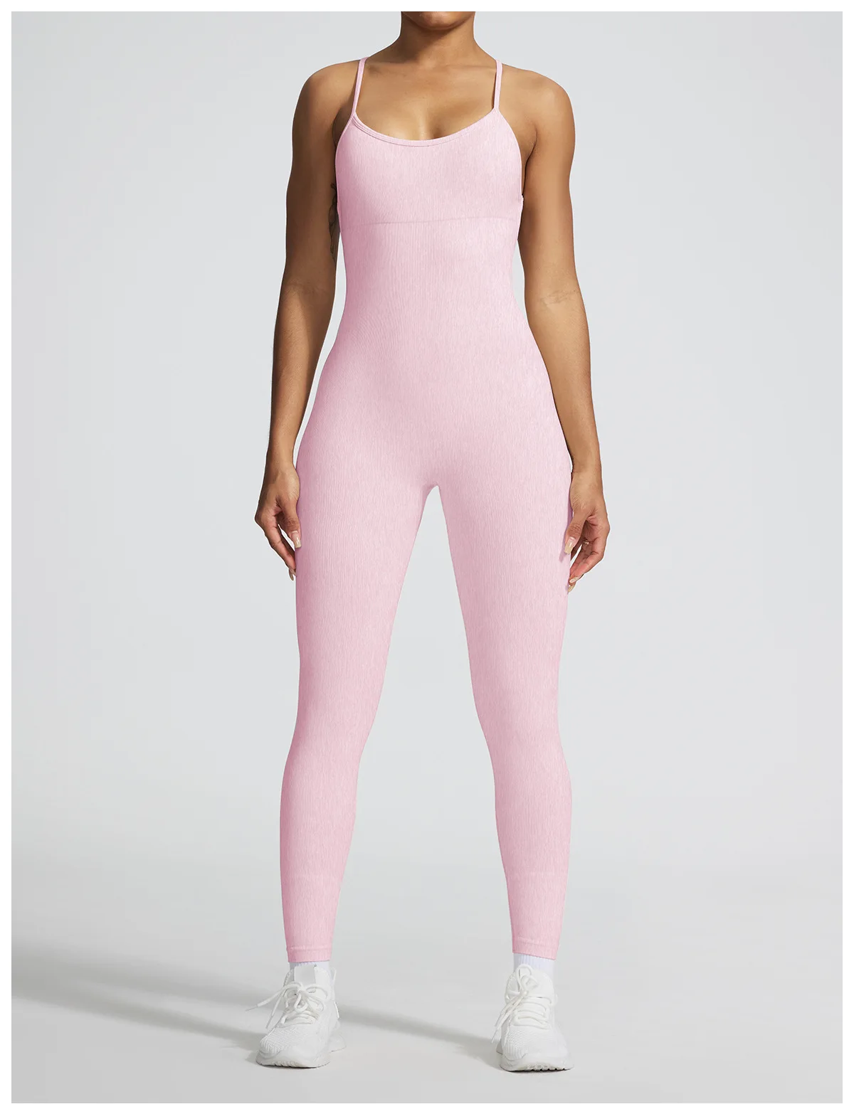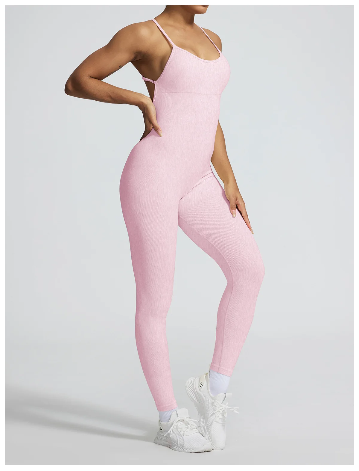 A sleeveless seamless jumpsuit designed for effortless comfort and fluid movement. The ribbed texture adds subtle structure, while the nylon and spandex blend follows the body naturally without compression.