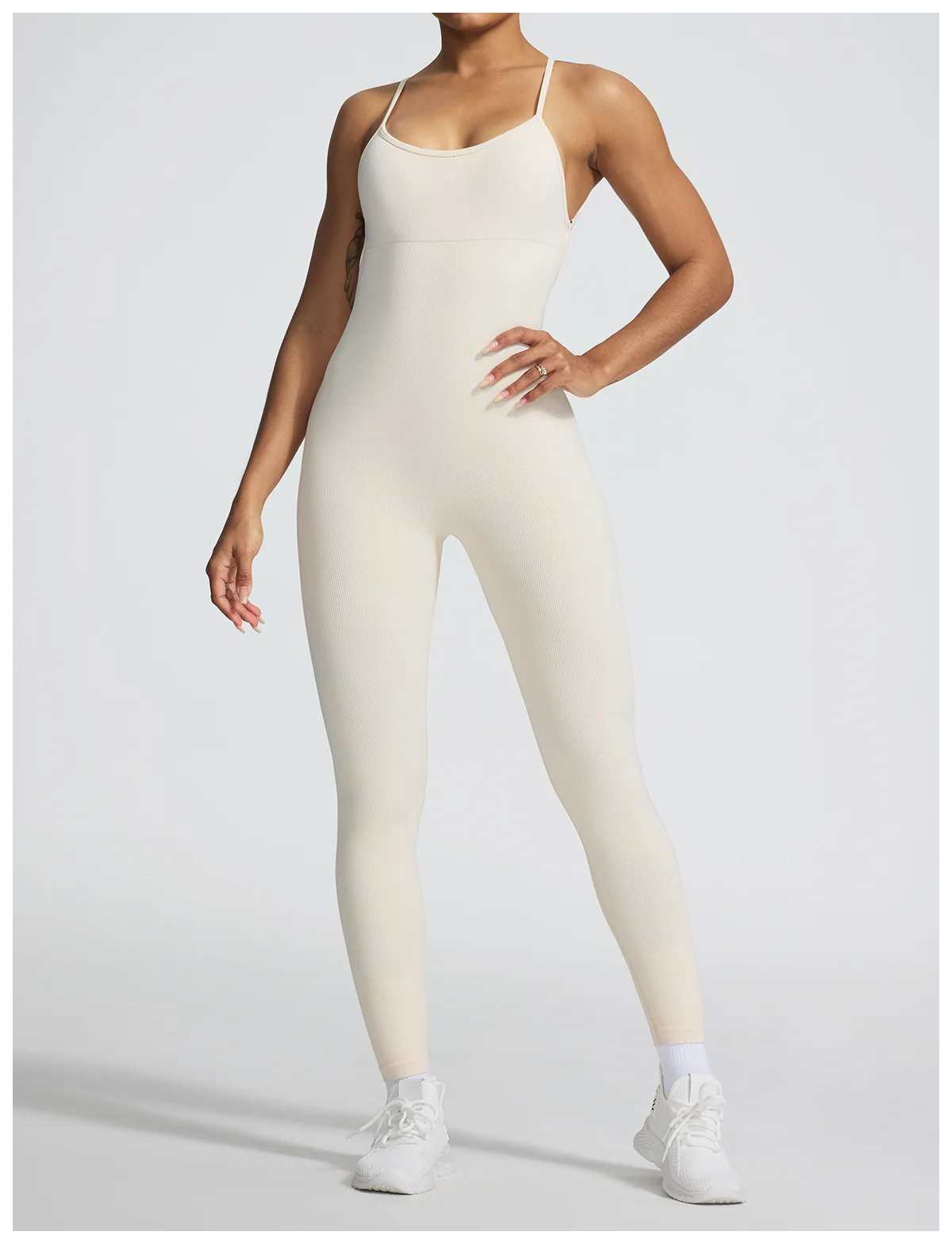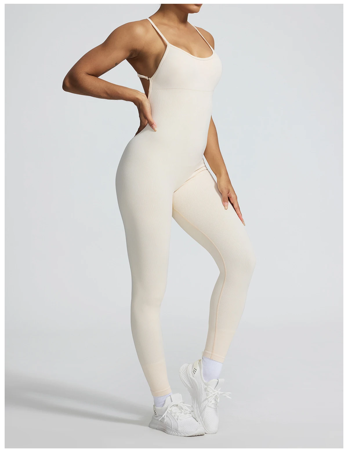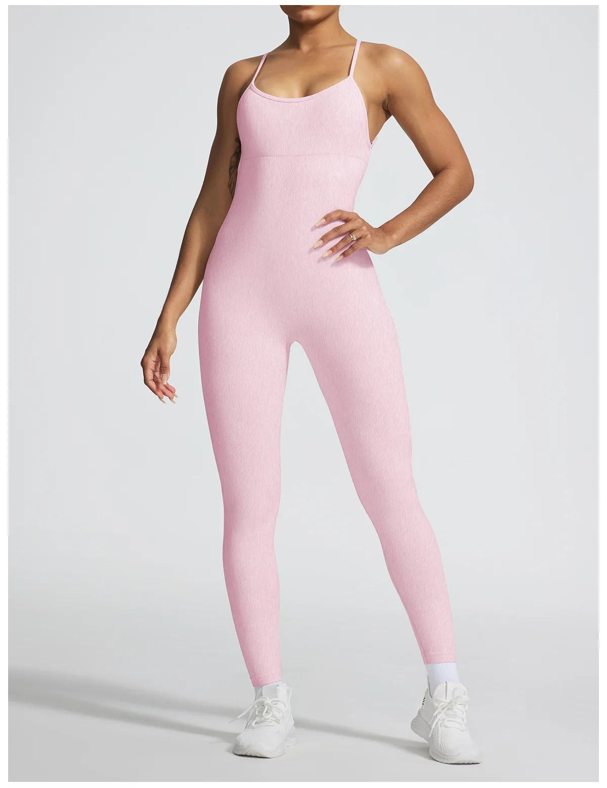 A sleeveless seamless jumpsuit designed for effortless comfort and fluid movement. The ribbed texture adds subtle structure, while the nylon and spandex blend follows the body naturally without compression.