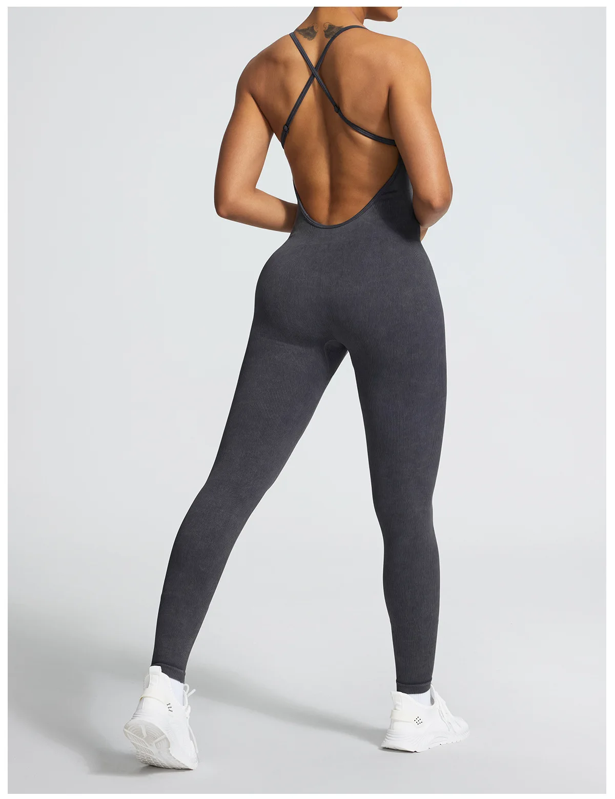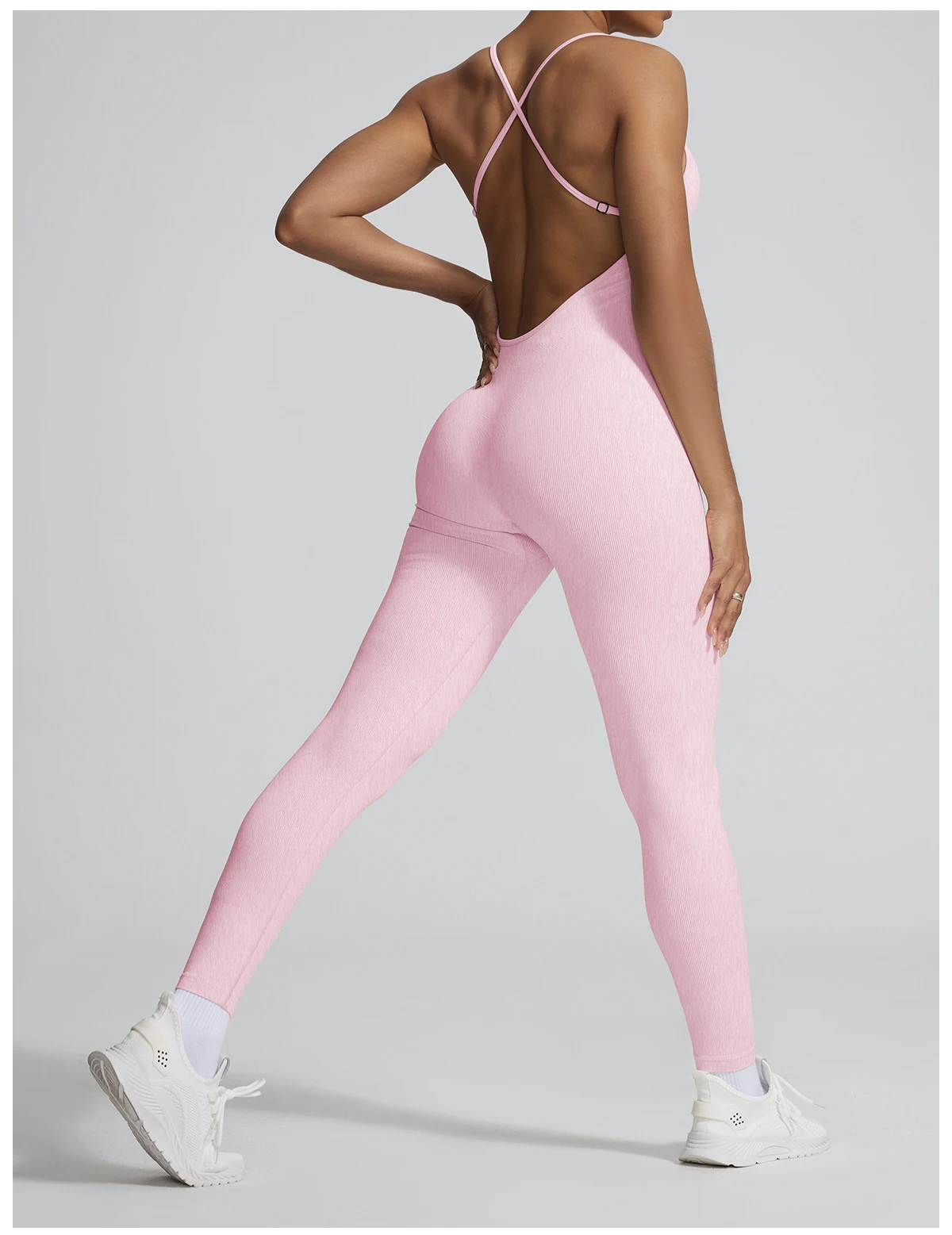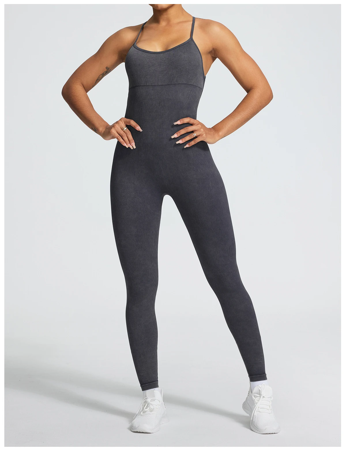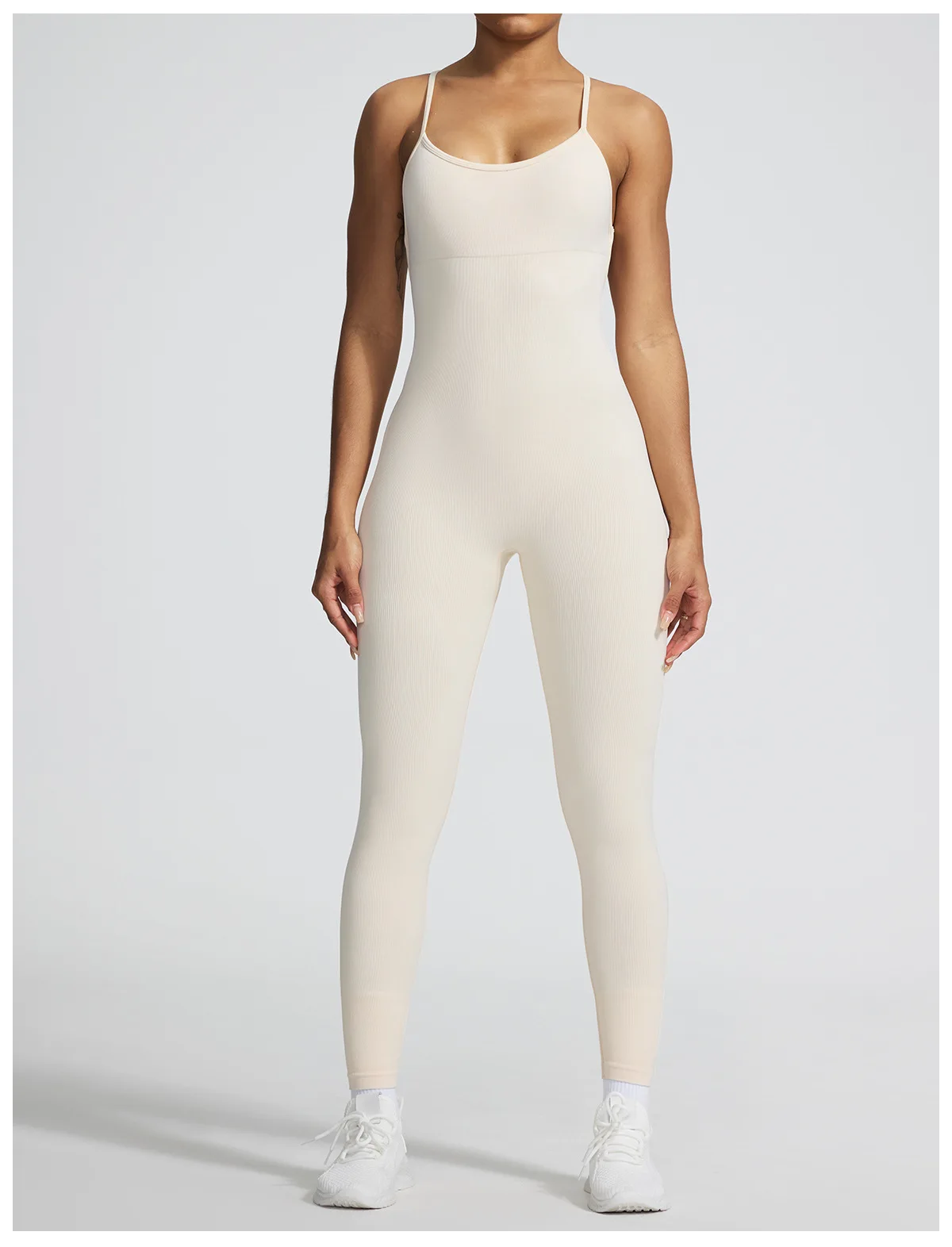 A sleeveless seamless jumpsuit designed for effortless comfort and fluid movement. The ribbed texture adds subtle structure, while the nylon and spandex blend follows the body naturally without compression.